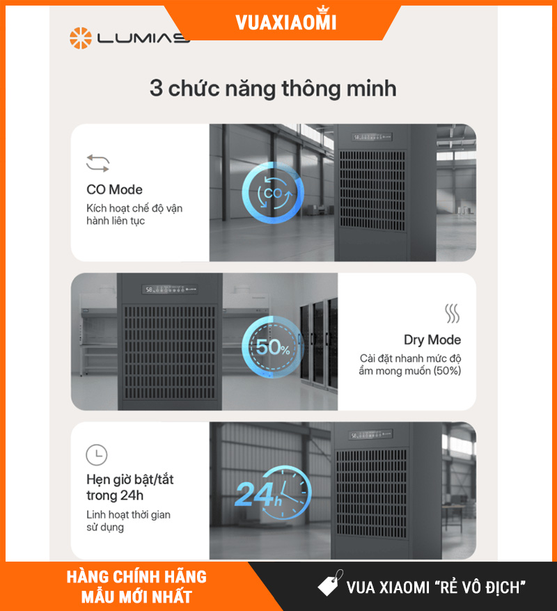 | Chế độ hoạt động | ① CO – Chạy liên tục ② Dry – Tự động duy trì độ ẩm 50% ③ Hẹn giờ bật/tắt 24 giờ |