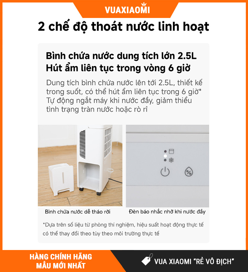 Xả liên tục bằng ống thoát nước 1m: phù hợp mùa nồm/mưa kéo dài, không phải canh đổ nước, rất tiện khi hong quần áo hoặc chạy nhiều giờ liên tục.