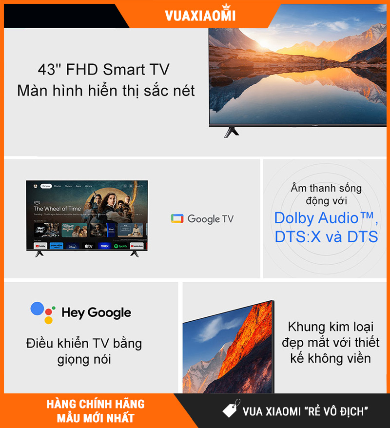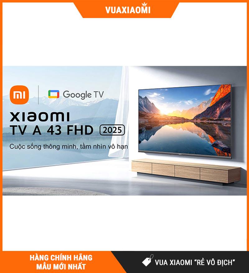 Tivi Xiaomi A43 FHD bản quốc tế là một trong những dòng tivi thông minh nổi bật thuộc phân khúc phổ thông của Xiaomi, hướng đến người dùng muốn trải nghiệm Smart TV hiện đại nhưng vẫn tối ưu chi phí. Với màn hình 43 inch Full HD, hỗ trợ 1,07 tỷ màu, thiết kế tràn viền tinh tế và hệ điều hành Google TV bản quốc tế – chiếc tivi này đáp ứng trọn vẹn nhu cầu giải trí gia đình: xem phim, YouTube, truyền hình online, nghe nhạc, điều khiển giọng nói và chia sẻ nội dung từ điện thoại.
