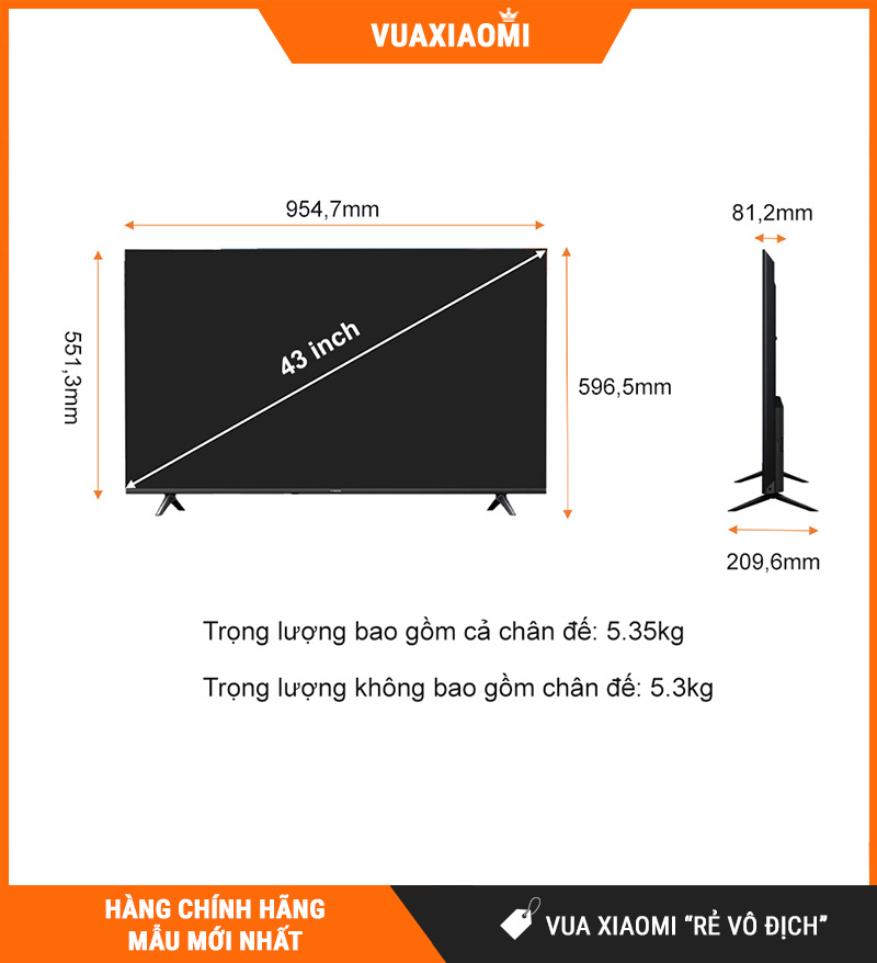| Kích thước (không chân đế) | 954.7 × 81.2 × 551.3 mm |