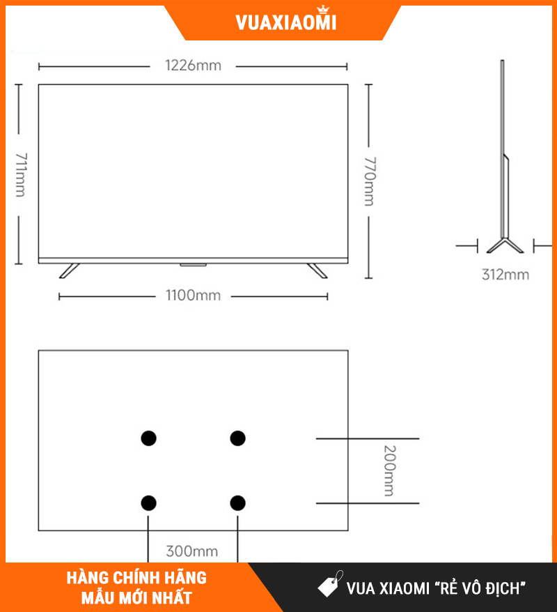 | Kích thước (có chân đế) | 1226 x 312 x 770 mm |