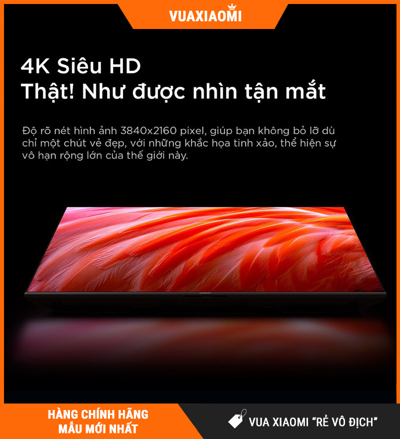 Tivi Xiaomi Redmi A55 sở hữu độ phân giải 4K UHD (3840 × 2160 pixels), gấp 4 lần so với độ phân giải Full HD thông thường. Với mật độ điểm ảnh cao, mọi nội dung bạn xem — từ phim ảnh, thể thao đến tài liệu — đều được hiển thị cực kỳ sắc nét và chi tiết.