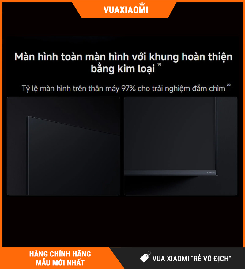 Không chỉ chú trọng vào công nghệ bên trong, Xiaomi còn đầu tư khá tốt cho thiết kế của mẫu TV này. Viền kim loại mang đến cảm giác chắc chắn, sang trọng và cao cấp hơn khi đặt trong không gian sống. Trong khi đó, tỷ lệ màn hình 97% giúp phần hiển thị trông rộng hơn, hiện đại hơn và tạo cảm giác tập trung hơn vào nội dung.