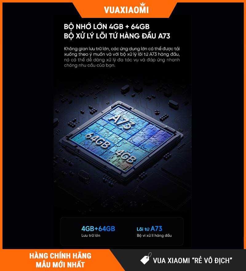 Bộ xử lý A73 mạnh mẽ, RAM 4GB – ROM 64GB