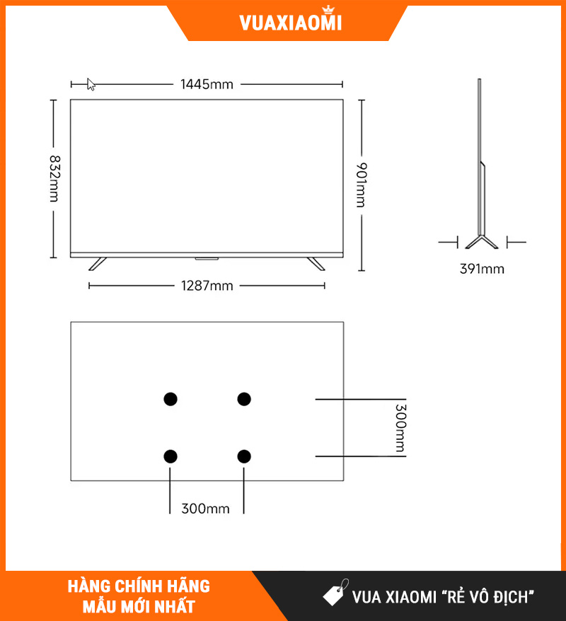 | Kích thước không gồm đế (D × R × C) | 1445 x 81 x 832 mm |