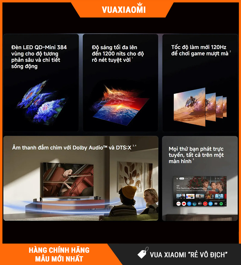 Điểm nổi bật của mẫu TV này nằm ở sự kết hợp giữa công nghệ Mini LED 384 vùng sáng, độ sáng tối đa 1200 nits, QLED Quantum Dot, cùng bộ xử lý hình ảnh thông minh giúp tối ưu chất lượng hiển thị trong nhiều điều kiện sử dụng khác nhau. Không chỉ vậy, TV còn được trang bị Google TV, Google Assistant, Apple AirPlay, Google Cast và hệ thống âm thanh cao cấp, biến chiếc TV thành trung tâm giải trí thực thụ cho cả gia đình.