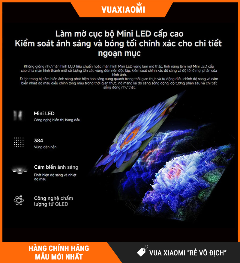 Một trong những điểm mạnh đáng chú ý nhất của Tivi Xiaomi S Mini LED 65 inch 2026 là công nghệ Mini LED với 384 vùng sáng, cho phép TV kiểm soát ánh sáng nền chính xác hơn so với các dòng TV LED thông thường.