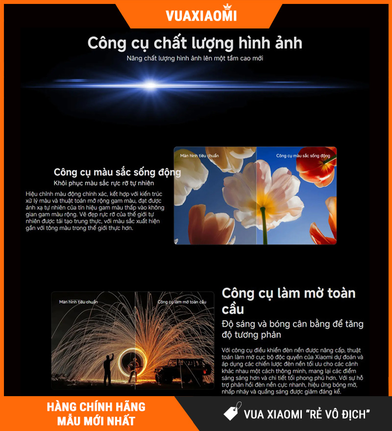 Cùng với Mini LED và Vivid Colour Engine, Global Dimming Engine đóng vai trò như một lớp tinh chỉnh thông minh giúp màn hình phản ứng linh hoạt hơn với từng cảnh quay. Công nghệ này đặc biệt hữu ích khi nội dung có nhiều thay đổi nhanh về ánh sáng hoặc chứa các lớp hình ảnh có độ tương phản phức tạp.