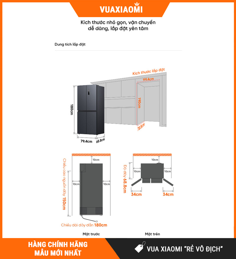 Chiều ngang chỉ ~79cm, chiều cao ~1.8m – vừa vặn với nhiều loại tủ bếp hiện đại, không quá cao như các tủ side-by-side.
